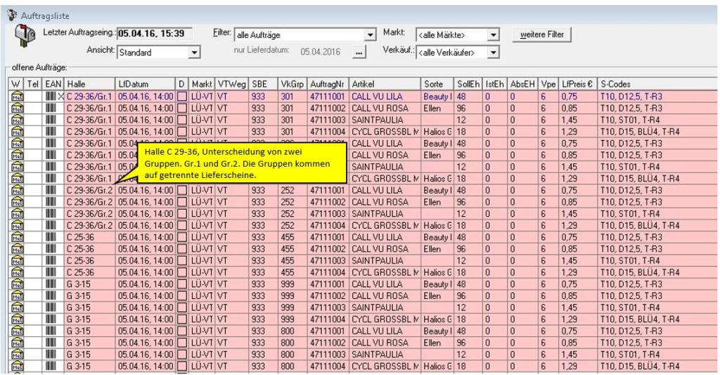 Landgard Vertrieb verwendet neue Hallenzuordnungen für Kunden. Im Auftrag wird die Hallenzuordnung übermittelt und in der Auftragsliste angezeigt (siehe Abbildung unten). Ein Lieferschein darf nur Ware für eine Hallennummer enthalten, z. B. C 25-36. In Halle C 29-36 gibt es jedoch eine weitere Unterteilung, die wir mit /Gr. 1 und /Gr.2 bezeichnet haben. Diese beiden Gruppen benötigen auch getrennte Lieferscheine. BLUCom achtet automatisch auf die Trennung der Lieferscheine. Es werden jedoch nur die Positionen derselben Halle, bzw. Hallengruppe 1 oder 2 zum Lieferschein übernommen. Unpassende Positionen verbleiben in der Auftragsliste.