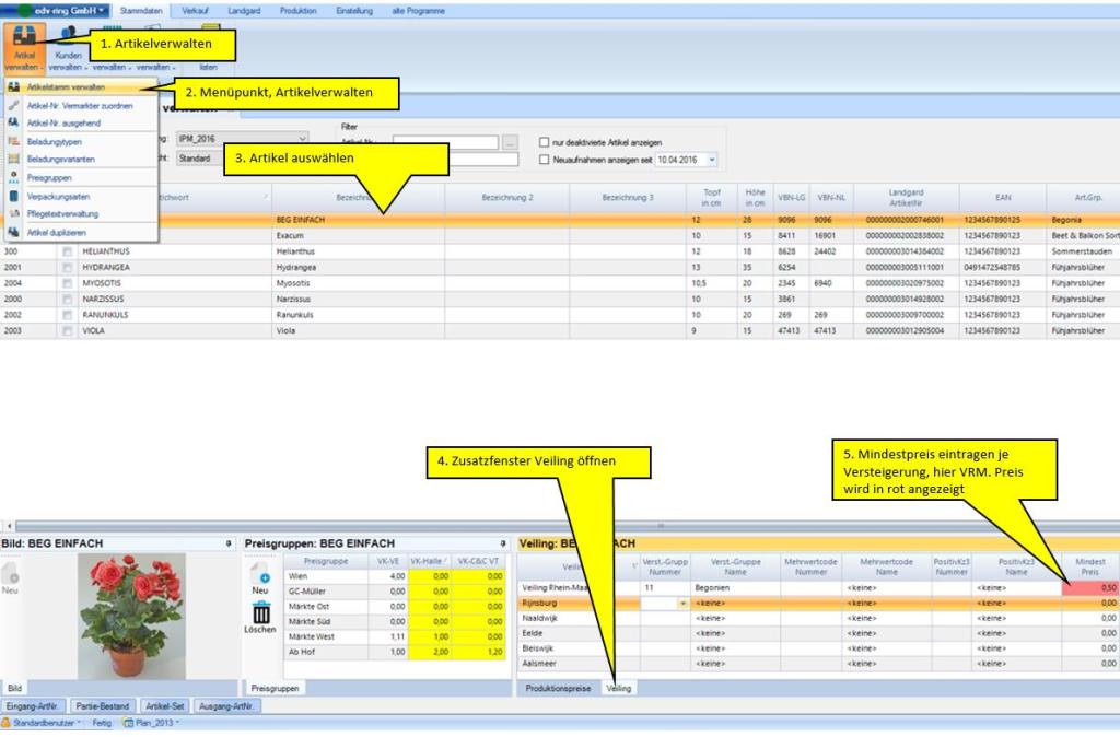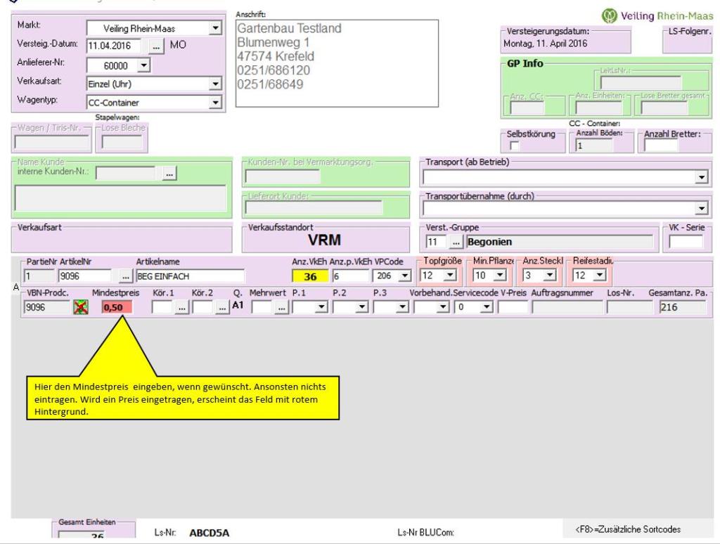 Neu in BLUCom ist, dass Sie jetzt einen Mindestpreis für Ihre Pflanzen bei der Versteigerung eingeben können. Über die Bedeutung und Regelungen hat Sie die VRM bereits in einem Newsletter informiert. Wenn Sie unsicher sind, verwenden Sie den Mindestpreis zunächst nicht und informieren sich bei Ihrem VRM Ansprechpartner.