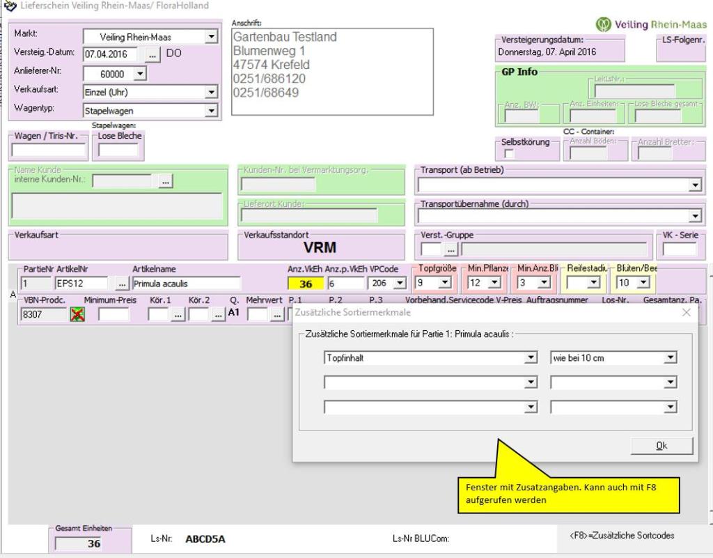 Schreiben Sie wie gewohnt einen Veiling-Lieferschein. Wenn Sie im letzten S-Code Feld (hier das gelbe Feld Blüten, siehe Abbildung unten) Enter drücken, erscheint das Zusatzfenster für weitere S-Codes. In diesen Feldern haben Sie Auswahlmenüs, in denen Sie Ihre Zusatzangaben eintragen können. Nach der Auswahl klicken Sie auf – OK – und schließen das Fenster. Danach führen Sie die weiteren Schritte wie üblich durch. Die Zusatzangaben werden nicht auf den Lieferschein gedruckt, sondern nur zur Veiling gesendet.