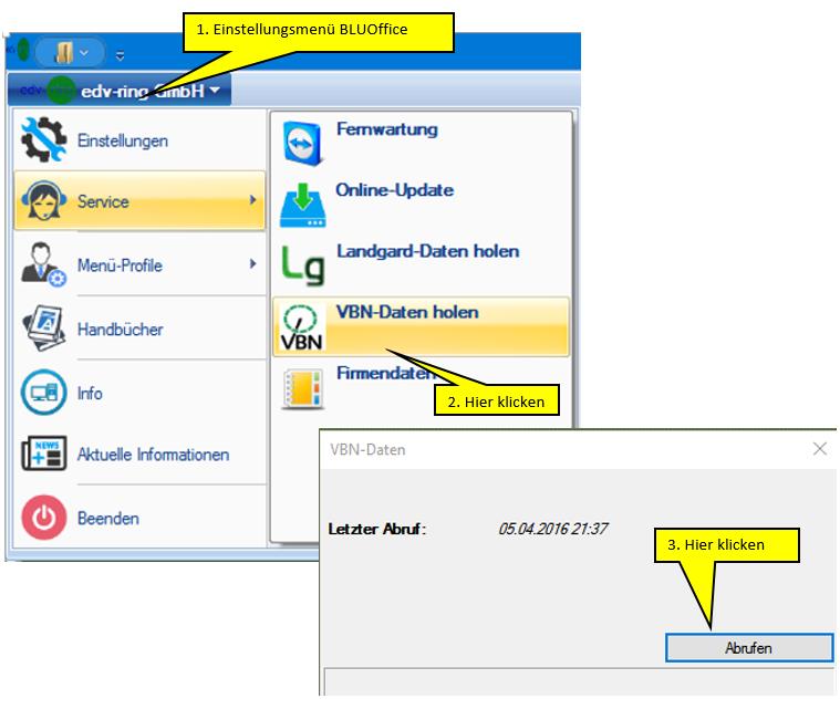 - Update der VRM-Artikelstammdaten (einmal notwendig). Damit Ihnen auch alle neuen S-Codes zur Verfügung stehen, müssen Sie ein Update der VBN-Nummern für Veiling durchführen. Klicken Sie auf das Einstellungsmenü von BLUOffice (1) und wählen Sie den Punkt ‘Service’. Dann wählen Sie den Punkt ‘VBN-Daten holen’ (2). Es erscheint das Startfenster, klicken Sie auf ‘Abrufen’ (3). Der Aktualisierungsvorgang startet dann. Wenn der Vorgang beendet ist, schließen Sie das Fenster.