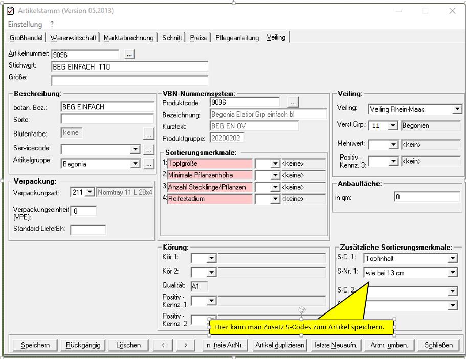Sie haben jetzt die Möglichkeit, neben den Standard-Sortierungscodes (S-Codes) im Lieferschein auch drei weitere S-Codes nach freier Auswahl an die Veiling zu senden. Einige Kunden benötigen diese Angabe zur Information über das Topfvolumen. Damit Sie diese Funktion nutzen können, führen Sie nach dem Online-Update die folgenden Schritte durch: