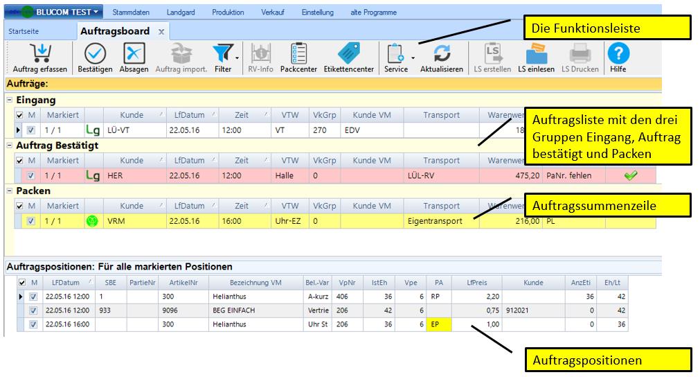 Die Auftragsliste ist aus folgenden Elementen aufgebaut: