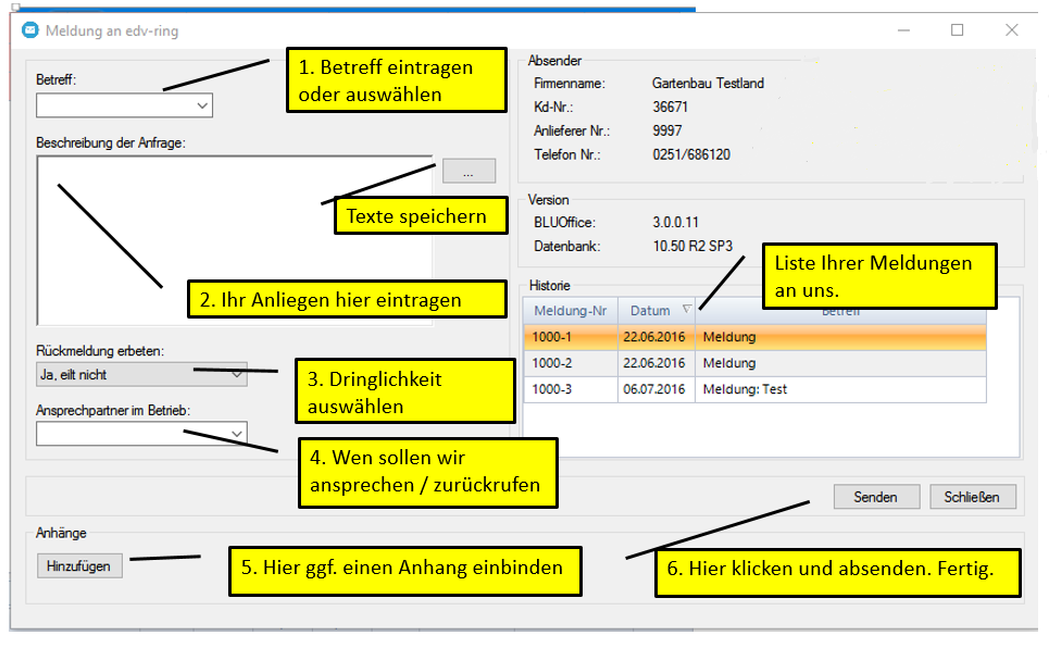 Hier können Sie Ihre Fragen, Probleme, Wünsche einfach an die edv-ring Hotline senden. Das geht etwa so wie bei einer E-Mail.