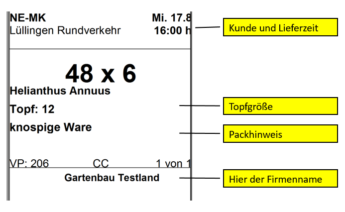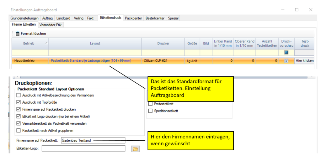Es ist auch möglich, den eigenen Firmennamen auf das Etikett zu drucken. Siehe dazu die Abbildung unten.