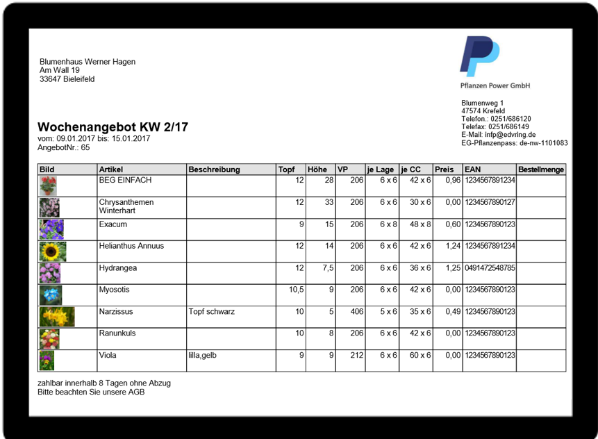 Das Musterangebot oben können Sie direkt aus BLUOffice an Ihren Kunden mailen.  Der Kunde erhält das Angebot in Form einer PDF und  Excel-Datei. Ihre Pflanzenbilder zum Artikel können in der Excel-Datei direkt vom Kunden online zur Ansicht aufgerufen werden.