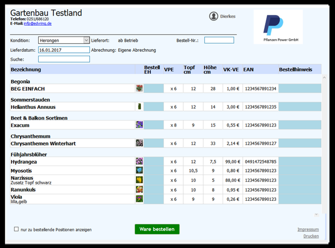 Die E-Bestellung ist Ihre aktuelle Bestellliste im Internet. Ihr Kunde hat hier die Möglichkeit, Ware über eine Website oder einer App direkt zu bestellen. Die Handhabung für den Kunden ist bewusst einfach und praktisch gehalten. Die Kundenbestellungen aus der E-Bestellung werden direkt in Ihr Auftragsboard übertagen und sehen dort zur Weiterverarbeitung bereit. Also kein abtippen der Kundenbestellung mehr notwendig. In BLUOffice stellen Sie im Basisangebot Ihre Angebotspositionen mit Pflanzenbeschreibung und Bildern zusammen. Dann stellen Sie Ihr Angebot im Internet bereit (Webshop).