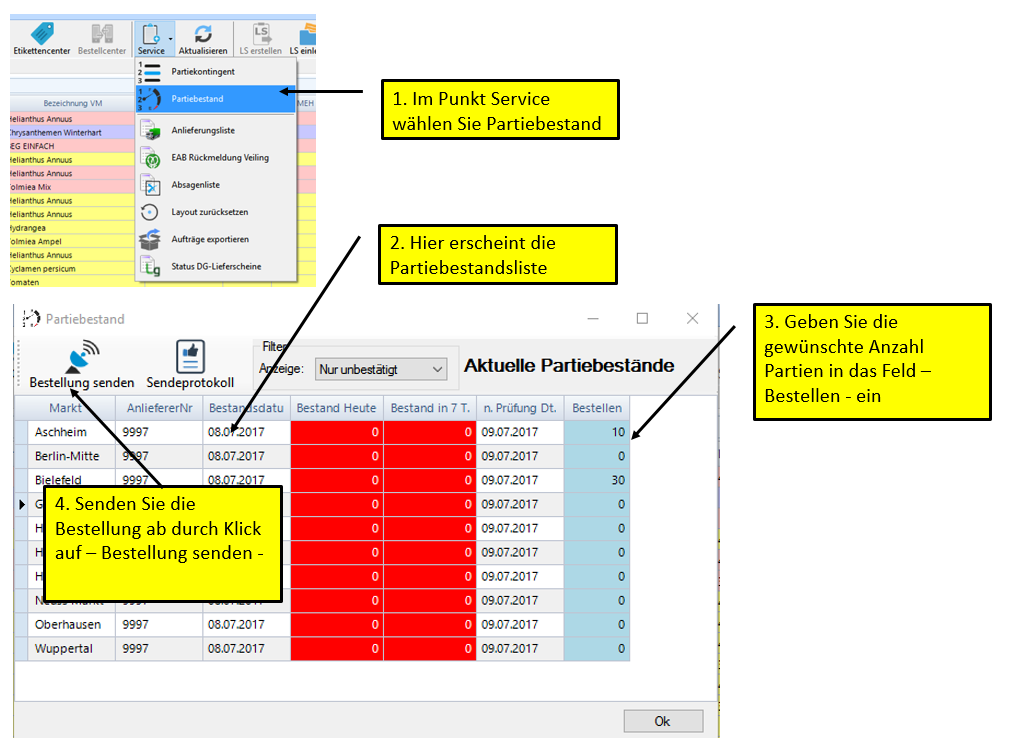 Sie finden die Funktion im Auftragsboard unter Service / Partiebestand. Handhabung siehe Bild 1.