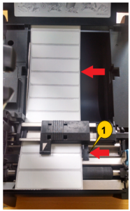 3. Richten Sie zudem die Arretierung der Etikettenbreite (1) an
