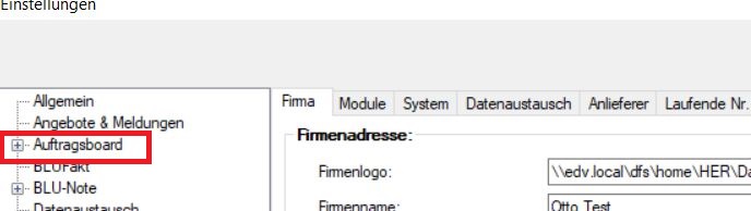 Es öffnet sich nun ein Fenster mit den BLUCom Einstellungen. Gehen Sie links in der Liste auf den Punkt “Auftragsboard”