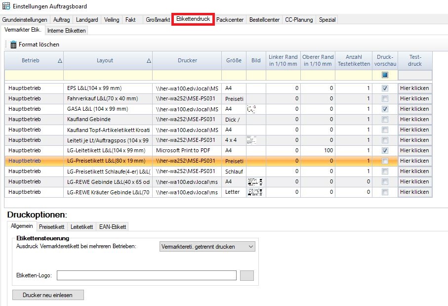 Wählen Sie den Reiter “Etikettendruck” aus und wählen Sie die Zeile “LG-Preisetikett(80x 19mm)” aus, die Zeile sollte Orange markiert sein.