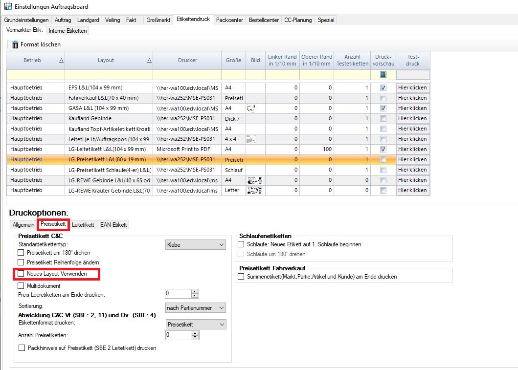 Gehen Sie nun unten auf den Reiter “Preisetikett”, dort können Sie dan haken für die Einstellung “Neues Layout Verwenden” setzen.